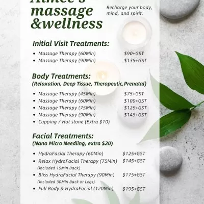 Welcome to Aimee’s Massage and Wellness, your local destination in NW Calgary for expert therapeutic massages designed to help you relax and rejuvenate. Conveniently located at 175 Dalcastle Way NW, our practice is committed to enhancing your well-being with personalized care in a soothing environment. Whether you’re seeking relief from tension or simply want to unwind, you’ll find dedicated service and professionalism here. Connect with us at aimeemassageyyc@gmail.com to book your appointment and start your journey toward better health and relaxation. see more detail